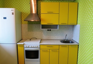 Кухня с фасадами из МДФ, покрытыми многослойной матовой эмалью, столешница из натурального дерева.